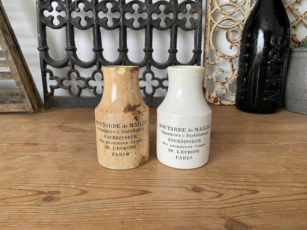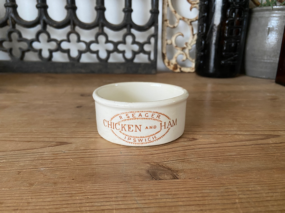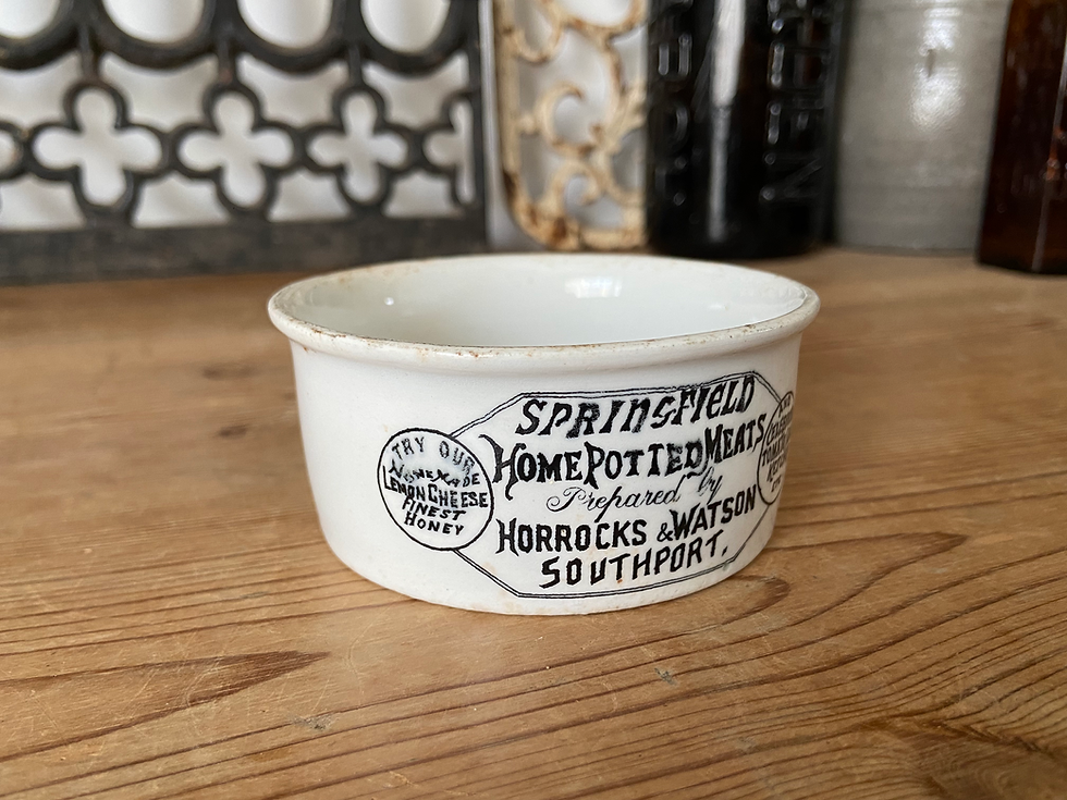 Antique advertising pots, butter knives, breadboards and butchers display items.